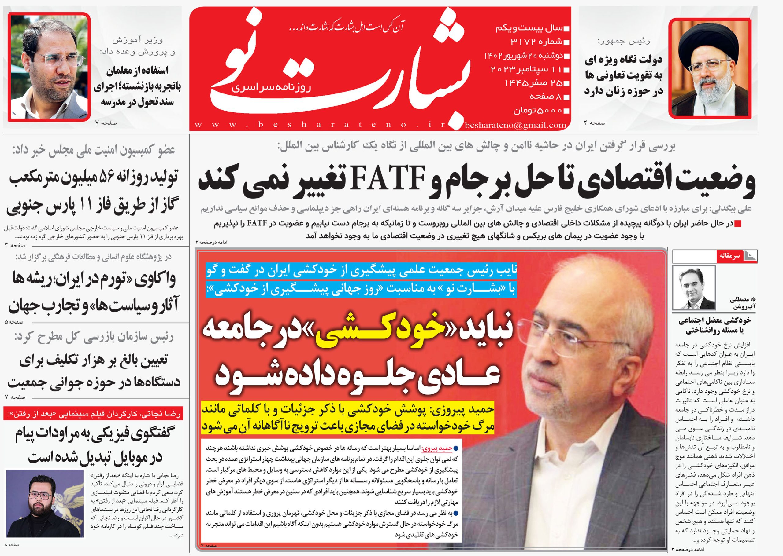 او در آخر تاکید کرد: «هیچ وقت در مسائل مربوط به سلامت روانی و اجتماعی دولت به تنهایی نمی تواند عمل کند. سمنها، سازمانها، رسانهها و … در حوزه پیشگیری از خودکشی نقش بیشتری از دولت می توانند داشته باشند. در خصوص بیمه شدن خدمات مربوط به سلامت روان، روانشناس هایی که در سیستم وزارت بهداشت در حال کار هستند می توانند از خدمات بیمه ای استفاده کنند. به طور کل خدمات سلامت روان هنوز توسط روانشناسهایی که دارای پروانه سازمان نظام روانشناسی و مشاوره کشور هستند بیمه نیست. قشری از روانشناسان بالینی دکتری که در وزارت بهداشت هستند خدماتشان تحت پوشش بیمه قرار گرفته است.»/🔴 منتشر شده در شماره 3172روزنامه بشارت نو مورخ 1402/06/20